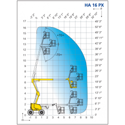 16 méter munkamagasságú kültéri kosaras emelő. Diesel meghajtású emelőgép, kültéri munkákra alkalmas. Összkerék meghajtású, így nehéz terepen is könnyedén mozog.