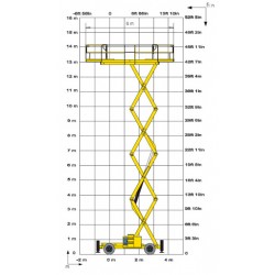 15 méter munkamagasságú kültéri ollós emelő. Diesel, összkerékhajtású gép kitalpalásokkal, kültéri munkákra.